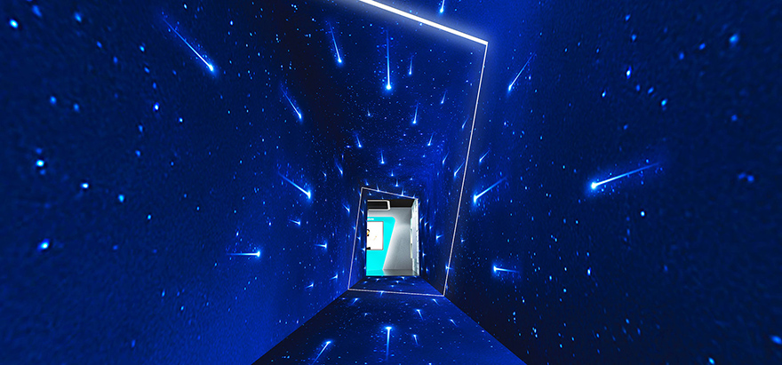 系统采用多面融合投影、特效动画及高保真音响等技术,打造穿越时空隧道的沉浸式体验空间,营造丰富的视觉特效与沉浸的体验。现场设置互动装置——未来星际飞行器,观众“乘坐”开始漫游星际之旅,体验穿越时空、太空历险、高速行驶、时空爱恋、灾难逃亡等多种惊险、刺激、神奇、浪漫、壮观之场面。