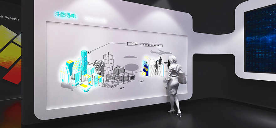 油墨导电互动墙系统是采用导电材料(金、银、铜和碳)分散在连结料中制成的糊状油墨,俗称糊剂油墨。具有一定程度导电性质,可作为印刷导电点或导电线路之用。金系导电墨、银系导电墨、铜系导电墨、碳系导电墨等已达到实用化,用于印刷电路、电极、电镀底层、键盘接点、印制电阻等材料。