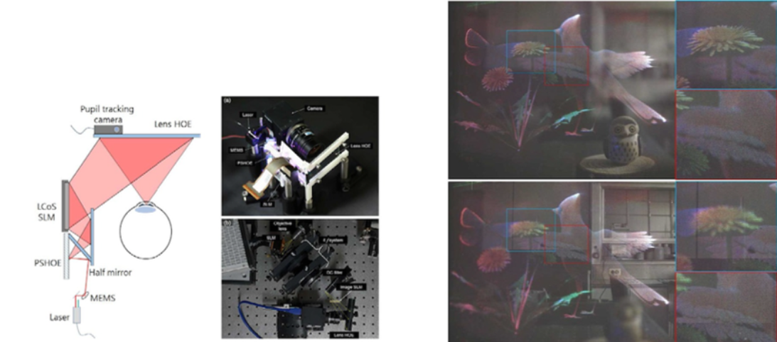 作为 动态全息设备(dynamic holographic display devices),可以替代传统 NED 的 2D 微显示板。作为一种动态器件,全息显示模块可以向用户的每只眼睛呈现 全息三维(3D) 图像。AR / VR NED的微型显示面板可以在面板表面再现空间幅度分布,从而呈现 2D 图像,而全息显示可以通过空间光调器 (SLM) 调制光的幅度或相位来重建所需 3D 图像的波前信息。它所提供的全单眼对焦线索在提供图像与真实物体的精确光学匹配,同时满足舒适观看的体验,并且不会出现聚散调节冲突 。另外,全息显示的波前重建能力可用于补偿NED 光学器件的像差,从而减少 NED 中所需的光学元件数量。另外,它还可以补偿眼睛像差,使视力校正显示能够呈现清晰的图像,无需额外的视力校正镜片。