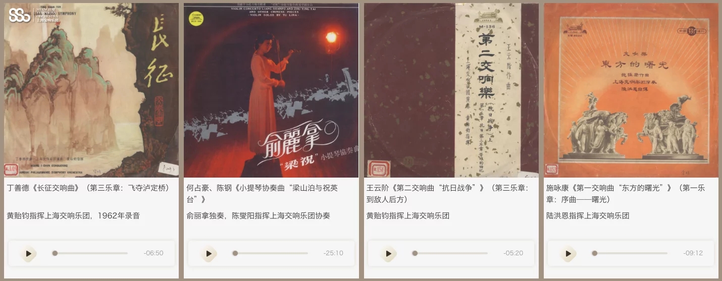 上海交响音乐博物馆里还有“数字视听室”,可以聆听中国交响音乐史上的珍贵作品录音,如黄贻钧指挥上海交响乐团在1962年录制的丁善德《长征交响曲》第三乐章,小提琴演奏家俞丽拿独奏、陈燮阳指挥上海交响乐团协奏的小提琴协奏曲《梁山伯与祝英台》等。