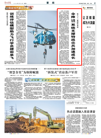 “伞降VR系统为新跳伞员提供沉浸式体验,感知不同的空中特情,能降低实际跳伞中的风险系数。”该旅领导介绍,他们通过引入伞降VR系统,利用空间定位、虚拟仿真、数据收集等技术构建逼真伞降环境。该系统能对跳伞训练数据进行效果评估,帮助官兵精准施训、科学训练,缩短战斗力生成周期。
