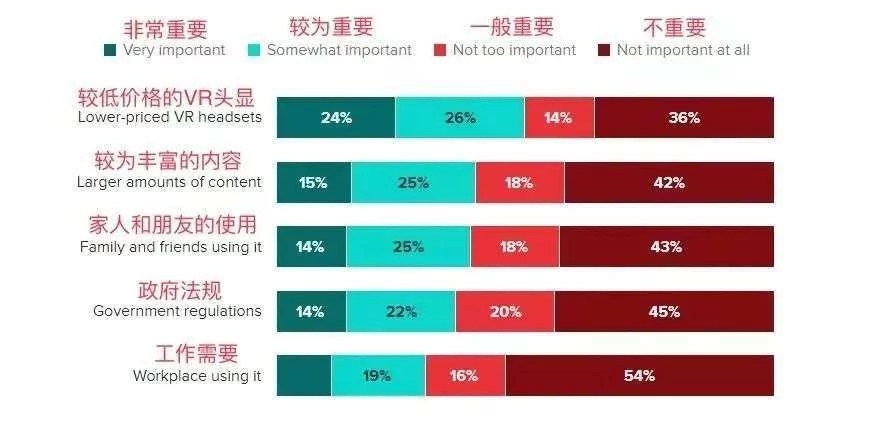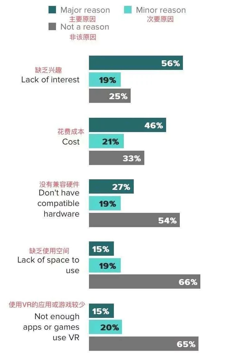 另有46%的人表示他们没有兼容的硬件,而大约三分之一的人则表示其留给VR设备的空间不足以及VR内容相对缺乏。