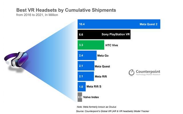 随着元宇宙概念的持续火爆,全球VR/AR市场在2021年迎来爆发式增长。国际数据公司(IDC)数据显示,2021年全球虚拟现实和增强现实(VR/AR)头戴设备市场同比增长92.1%,出货量达到1120万台,其中Meta Quest 2是迄今为止最受欢迎的产品,在2021年VR/AR综合市场中占有78%的份额,引领VR/AR市场。另据Counterpoint调研显示,Meta Quest 2 2021年总销量超过1000万台,准确说是1040万台。
